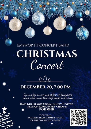 Get your tickets for Emsworth Concert Band's Christmas Concert at the fabulous Hayling Island Community Centre on Saturday 20th December - starting 7.00pm. The concert will packed with festive music. The venue has a beautiful concert stage and seating, and there is a bar for drinks before and during the interval. This will be a sell-out concert so buy as soon as you can!