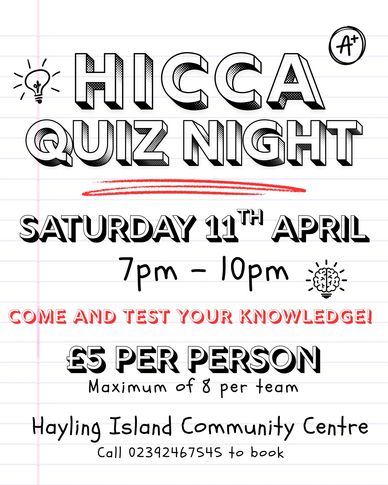 Prepare yourself for an evening filled with excitement and friendly rivalry at the HICCA Quiz Night Fundraiser! Mark your calendars for Saturday, 11th April, at the Hayling Island Community Centre.