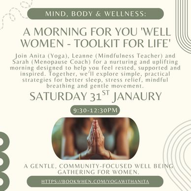 Join Anita (Yoga), Leanne (Mindfulness Teacher) and Sarah (Menopause Coach) for a nurturing and uplifting morning designed to help you feel rested, supported and inspired. Together, we’ll explore simple, practical strategies for better sleep, stress relief, mindful breathing and gentle movement.