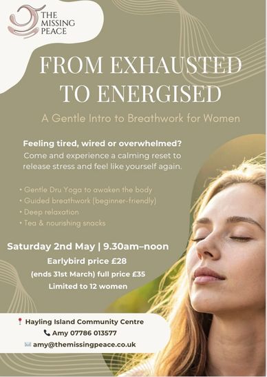 A workshop for you, if you’re feeling tired, it was a very wet winter here on Hayling! Join us, and put a spring in your step! It’s at Hayling Island Community Centre, and it is for you if you are overdue some self-care.